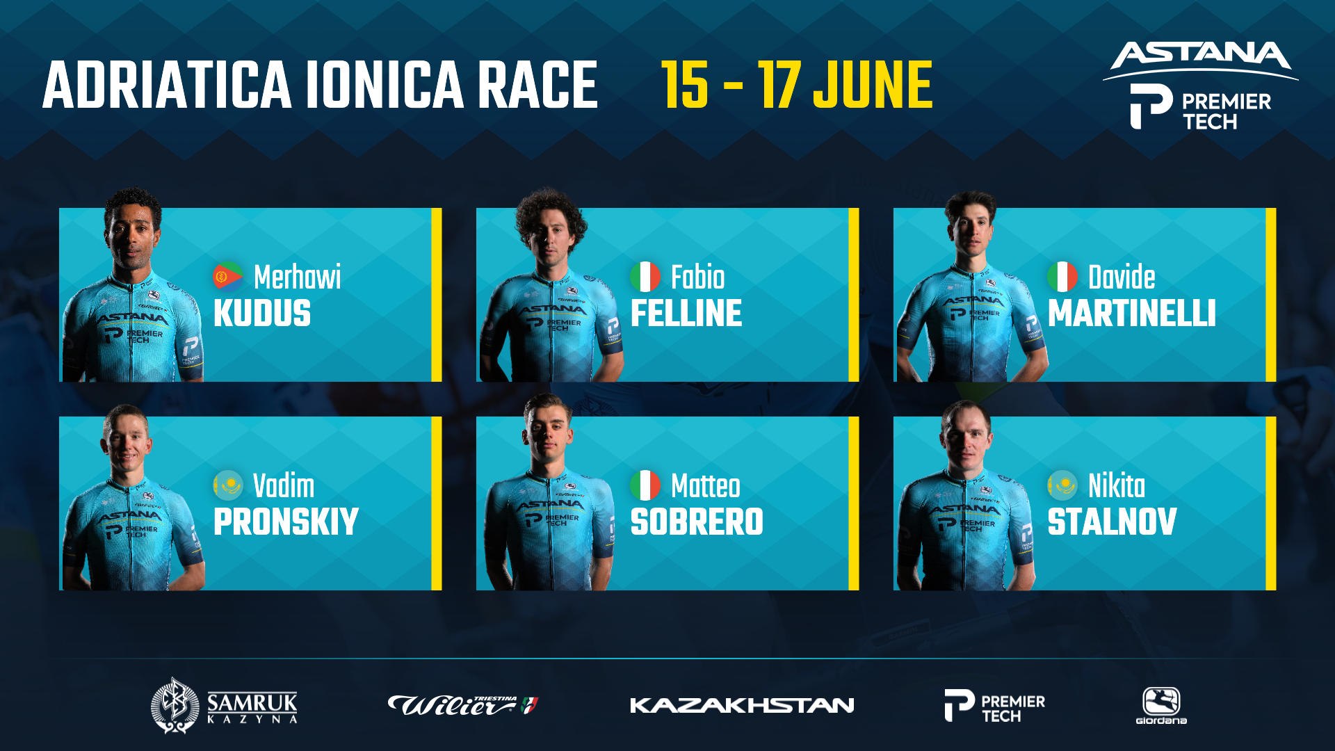 Команда Astana – Premier Tech выступит на многодневной гонке категории 2.1 "Адриатика-Ионика", которая пройдет в Италии в период с 15 по 17 июня. Состав команды: Фабио Феллине (Италия), Давиде Мартинелли (Италия), Мерхави Кудус (Эритрея), Маттео Собреро (Италия), Вадим Пронский (Казахстан), Никита
