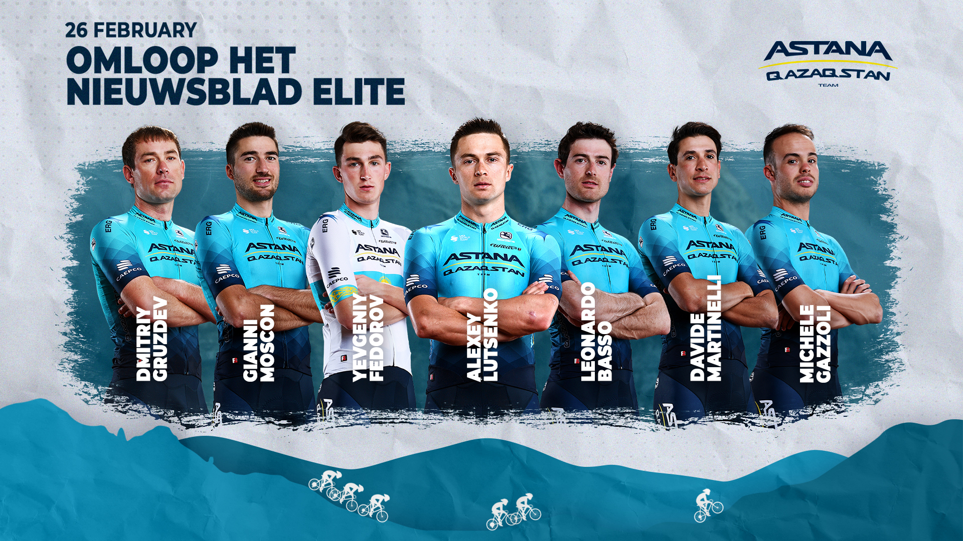 Команда Astana Qazaqstan Team выступит на первой европейской гонке Мирового Тура - классике "Омлууп Хет Ньюзблад Элит", которая пройдет в Бельгии 26 февраля. Состав команды: Леонардо Бассо (Италия), Микеле Гадзоли (Италия), Дмитрий Груздев (Казахстан), Евгений Федоров (Казахстан), Алексей Луценко (Казахстан), Давиде