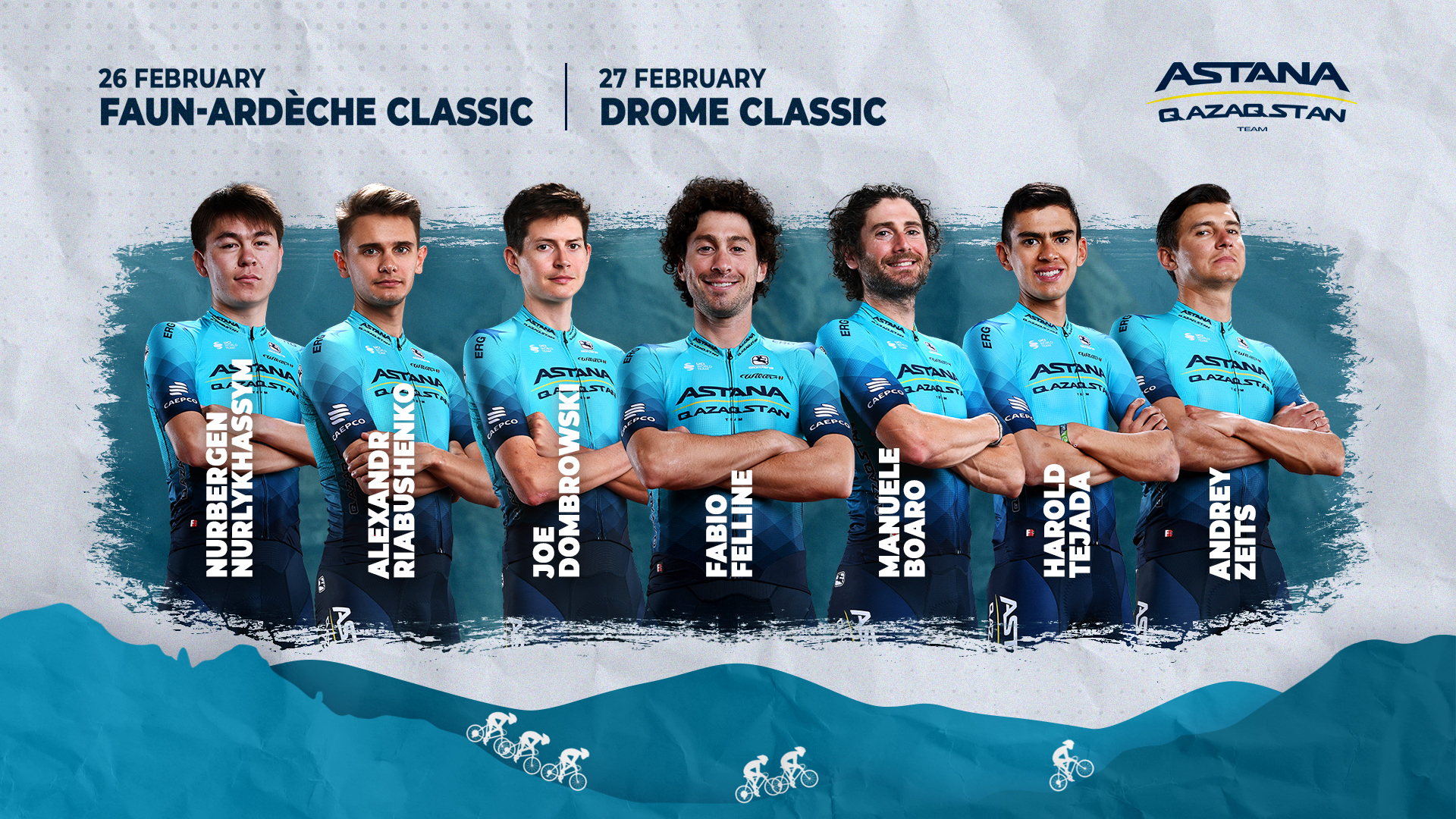 Команда Astana Qazaqstan Team выступит на двух однодневных гонках во Франции: Фаун-Ардеш Классик (26 февраля) и Дром Классик (27 февраля). Состав команды: Джо Домбровски (США), Фабио Феллине (Италия), Мануэле Боаро (Италия), Нурберген Нурлыхасым (Казахстан), Александр Рябушенко (Беларусь), Харольд Техада (Колумбия), Андрей