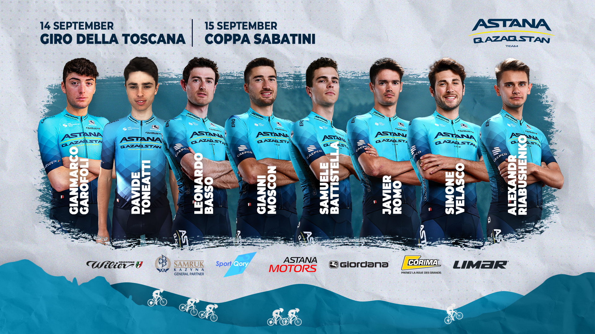 Команда Astana Qazaqstan Team выступит на двух однодневных гонках в Италии: "Джиро делла Тоскана" (14 сентября) и "Коппа Сабатини" (15 сентября). Состав команды: Леонардо Бассо, Самуэле Баттистелла (только Джиро делла Тоскана), Джанни Москон, Александр Рябушенко, Хавьер Ромо, Симоне Веласко (только Коппа