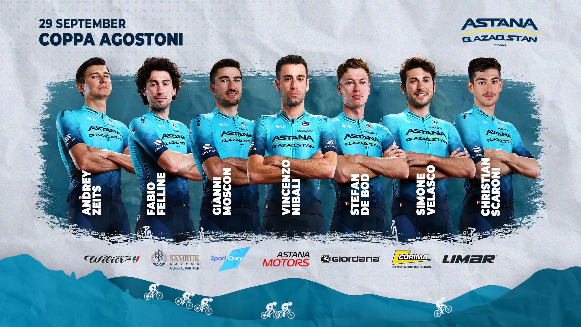 Команда Astana Qazaqstan Team начинает осенний сезон итальянских классических гонок выступлением на "Коппа Агостони", которая пройдет 29 сентября. Состав команды: Стефан Де Бод (ЮАР), Фабио Феллине (Италия), Джанни Москон (Италия), Винченцо Нибали (Италия), Кристиан Скарони (Италия), Симоне Веласко (Италия), Андрей Зейц