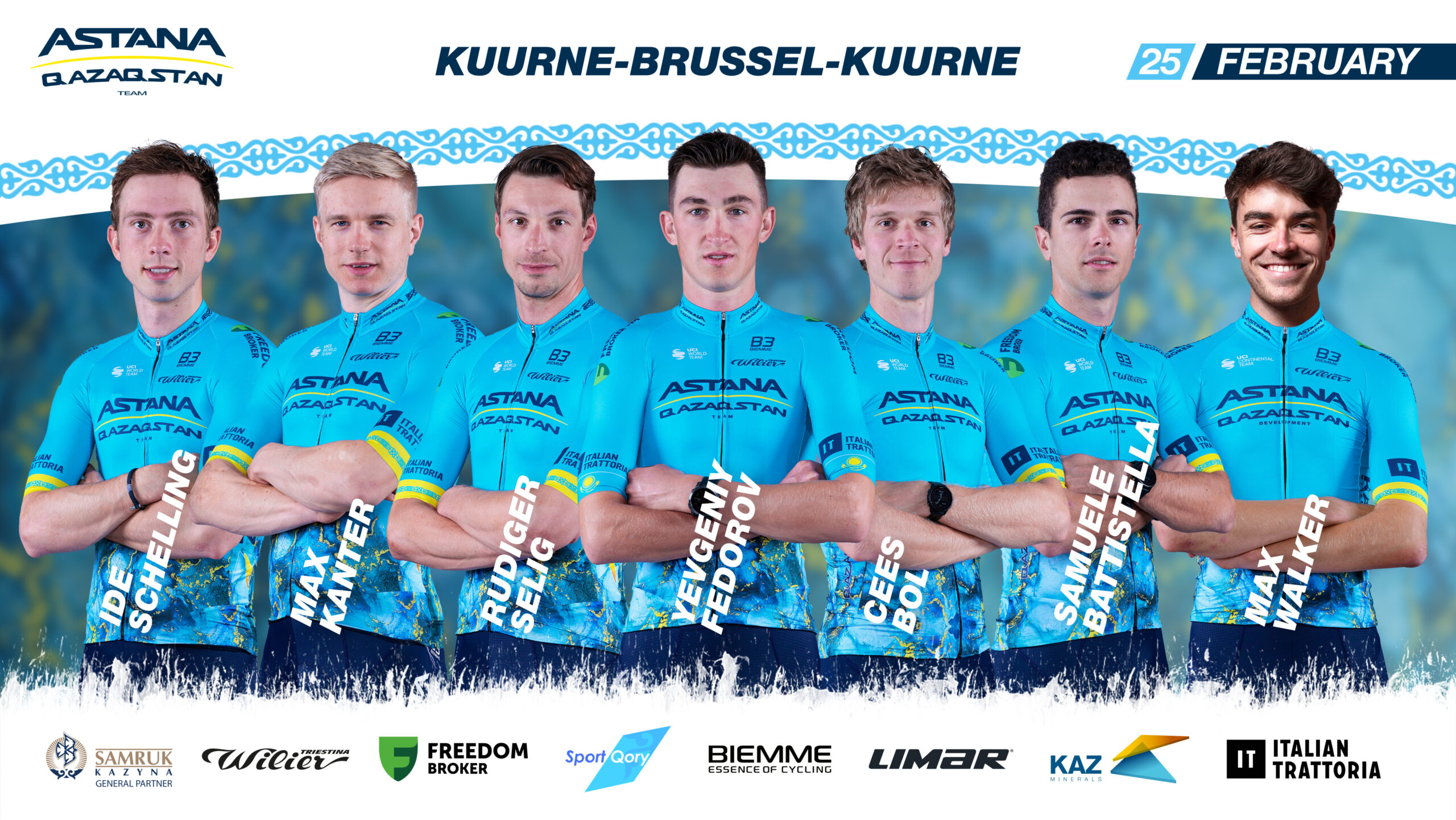 Команда Astana Qazaqstan Team примет участие в бельгийской классической гонке "Кюрне-Брюссель-Кюрне, которая пройдет 25 февраля. Состав команды: Самуэле Баттистелла, Кейс Бол, Евгений Федоров, Макс Кантер, Иде Схеллинг, Ридигер Зелиг, Макс Уолкер (Astana Qazaqstan Development Team). Спортивные директора в гонке: Стефано Занини, Марио