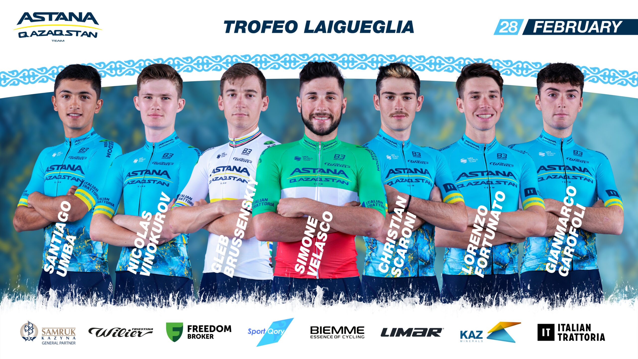 Команда Astana Qazaqstan Team выступит на итальянской однодневной гонке высшей категории "Трофео Лайгуэлья", которая пройдет 28 февраля. Состав команды: Глеб Брусенский, Лоренцо Фортунато, Джанмарко Гарофоли, Кристиан Скарони, Симоне Веласко, Николя Винокуров, Сантьяго Умба. Спортивный директор в гонке: Александр Шефер. При поддержке Генерального партнера