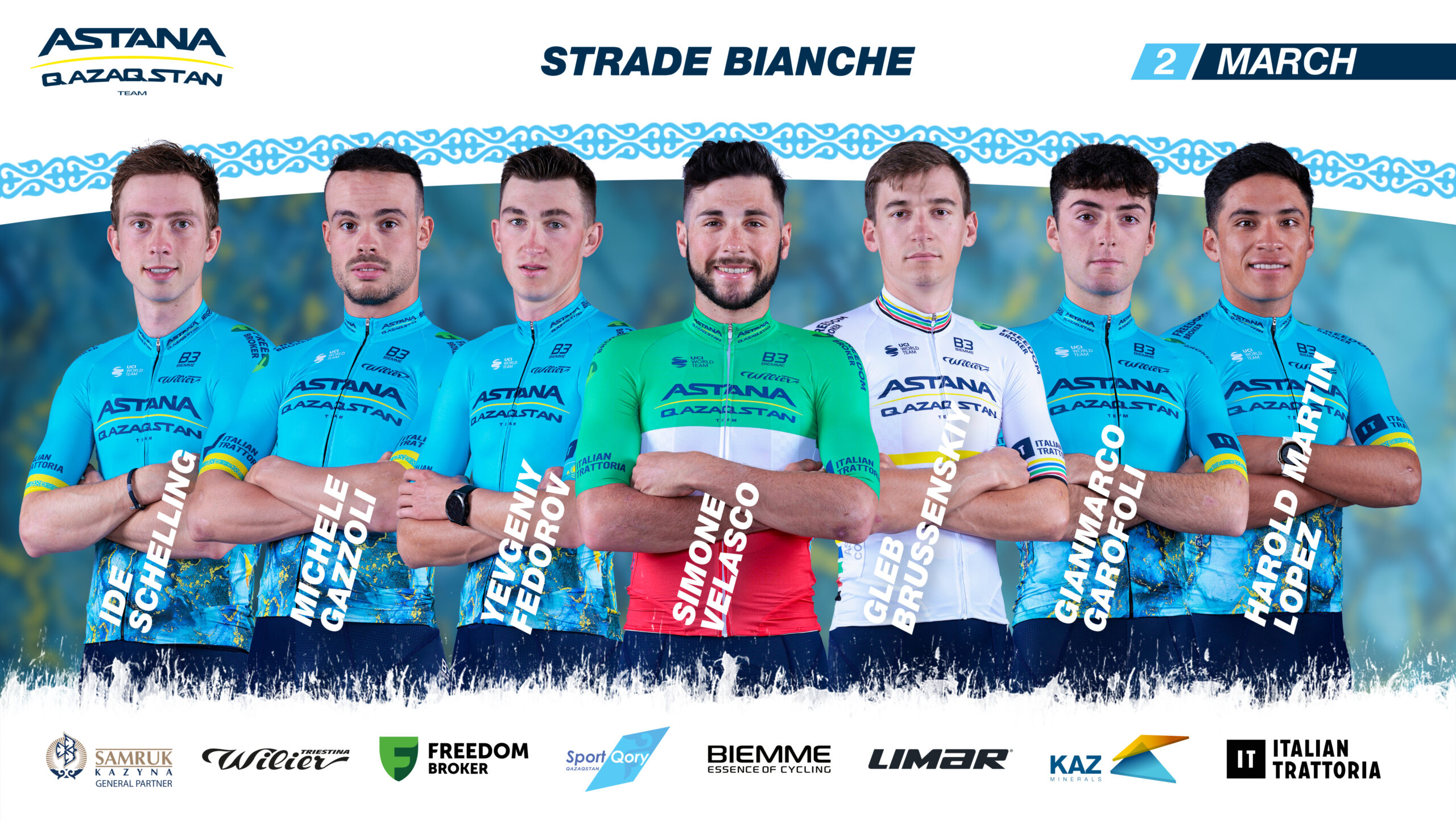 Команда Astana Qazaqstan Team примет участие в однодневной гонке Мирового Тура "Страде Бьянке", которая пройдет в Италии 2 марта. Состав команды: Глеб Брусенский, Евгений Федоров, Джанмарко Гарофоли, Микеле Гадзоли, Харольд Мартин Лопес, Иде Схеллинг, Симоне Веласко. Спортивные директора в гонке: Стефано Занини,