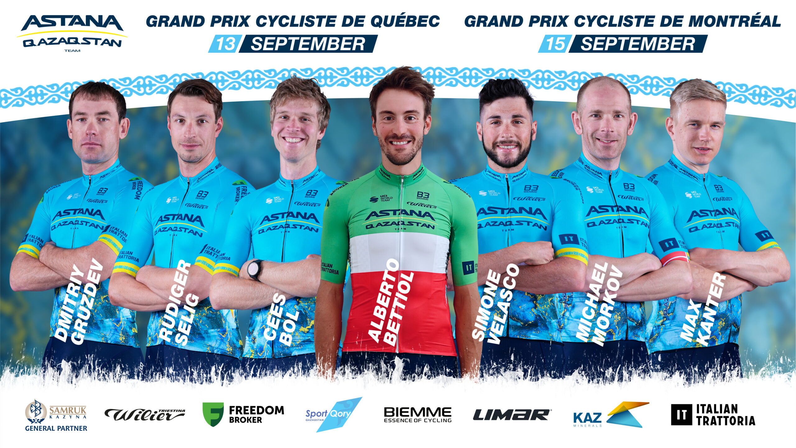Astana Qazaqstan Team will take part in two UCI WorldTour events in Canada - Grand Prix Cyclists de Québec (September 13th) and Grand Prix Cycliste de Montréal (September 15th). Rider roster: Cees Bol, Alberto Bettiol, Michael Mørkøv, Simone Velasco, Max Kanter,