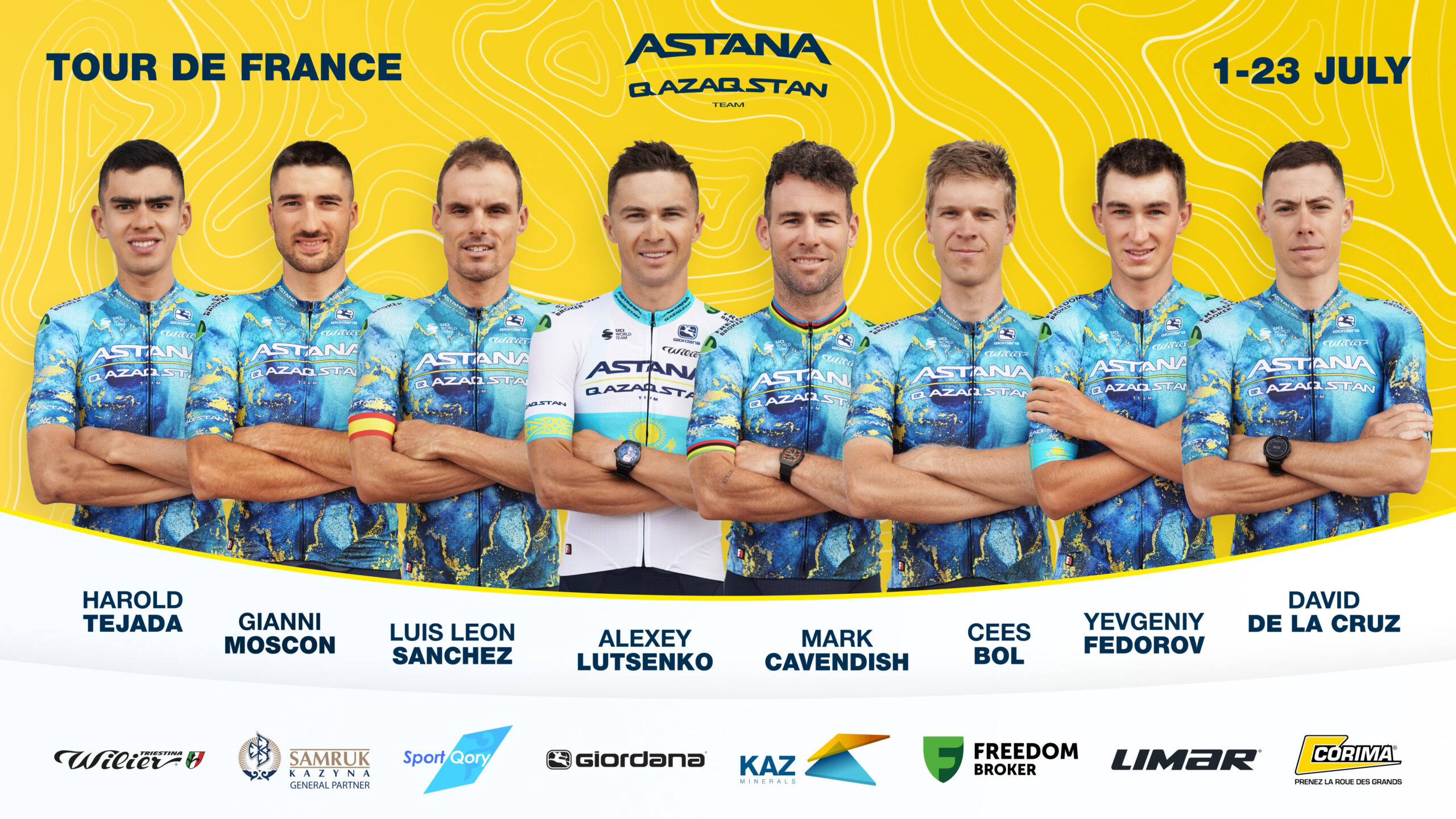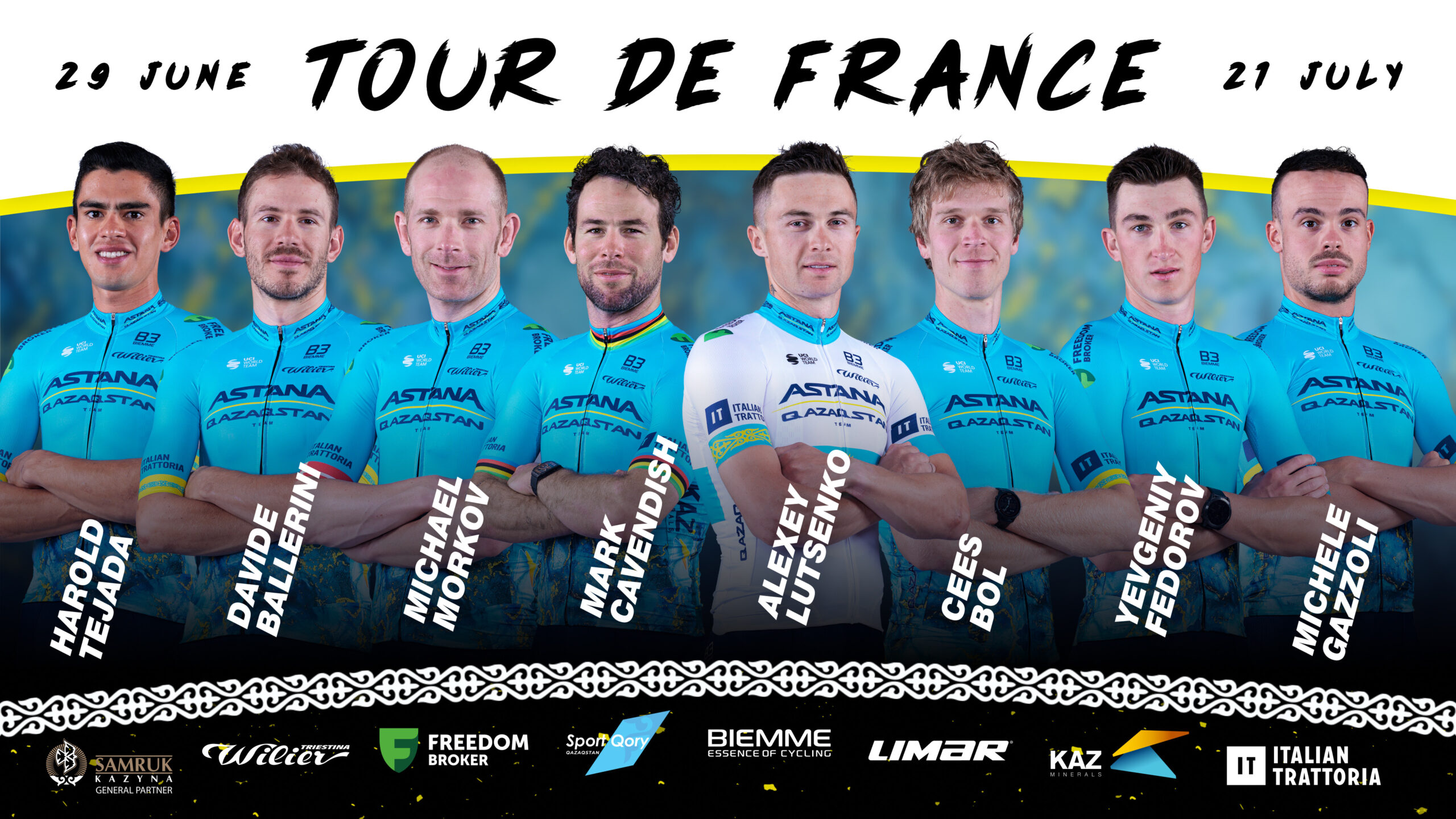 Команда Astana Qazaqstan Team представляет свой состав на главную супермногодневку сезона "Тур де Франс", которая пройдет в период с 29 июня по 21 июля. Состав команды: Марк Кавендиш, Микаэль Мёркёв, Алексей Луценко, Евгений Федоров, Кейс Бол, Харольд Техада, Давиде Баллерини, Микеле