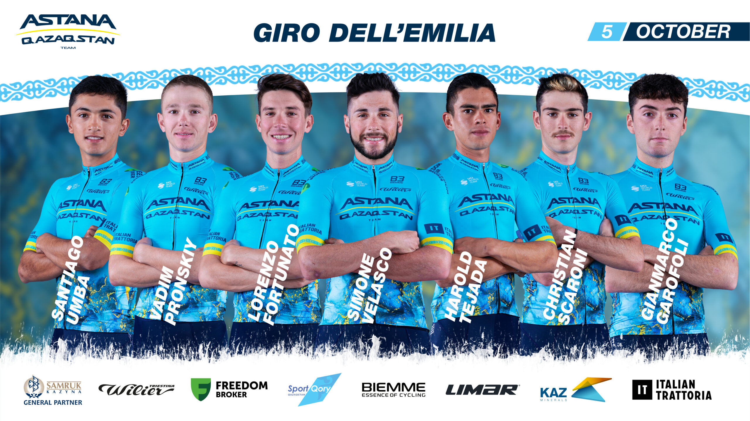 Astana Qazaqstan Team is going to start its Italian autumn classic campaign with 1.Pro race Giro dell'Emilia, which will be held on October 5th. Rider roster: Simone Velasco, Christian Scaroni, Harold Tejada, Lorenzo Fortunato, Santiago Umba, Gianmarco Garofoli, Vadim Pronskiy. Sports director