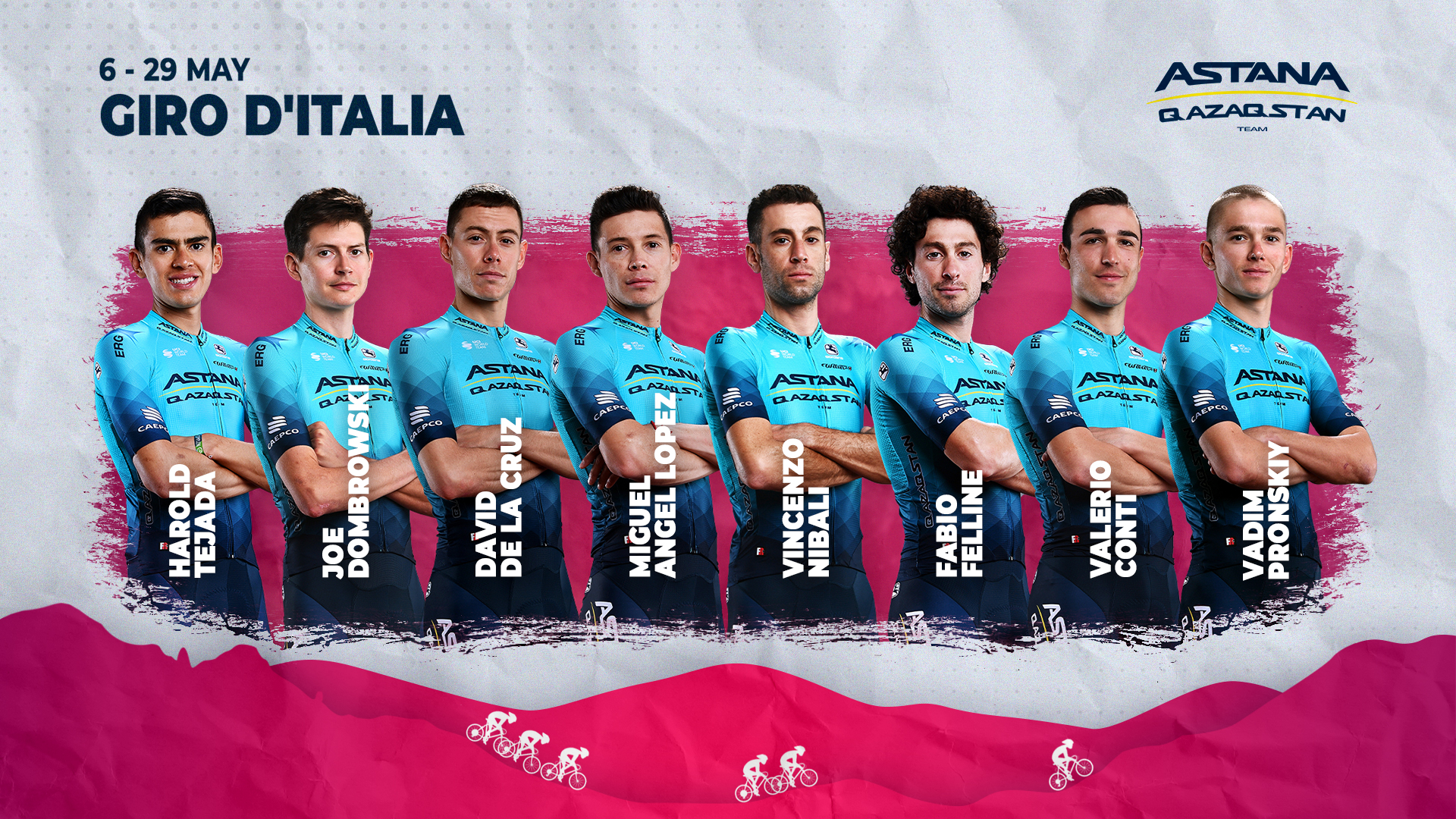 Команда Astana Qazaqstan Team рада представить свой состав на первый Гранд-тур сезона - "Джиро д'Италия", который пройдет по территории Венгрии и Италии в период с 6 по 29 мая. Состав команды: Мигель Анхель Лопес (Колумбия), Винченцо Нибали (Италия), Давид Де Ла